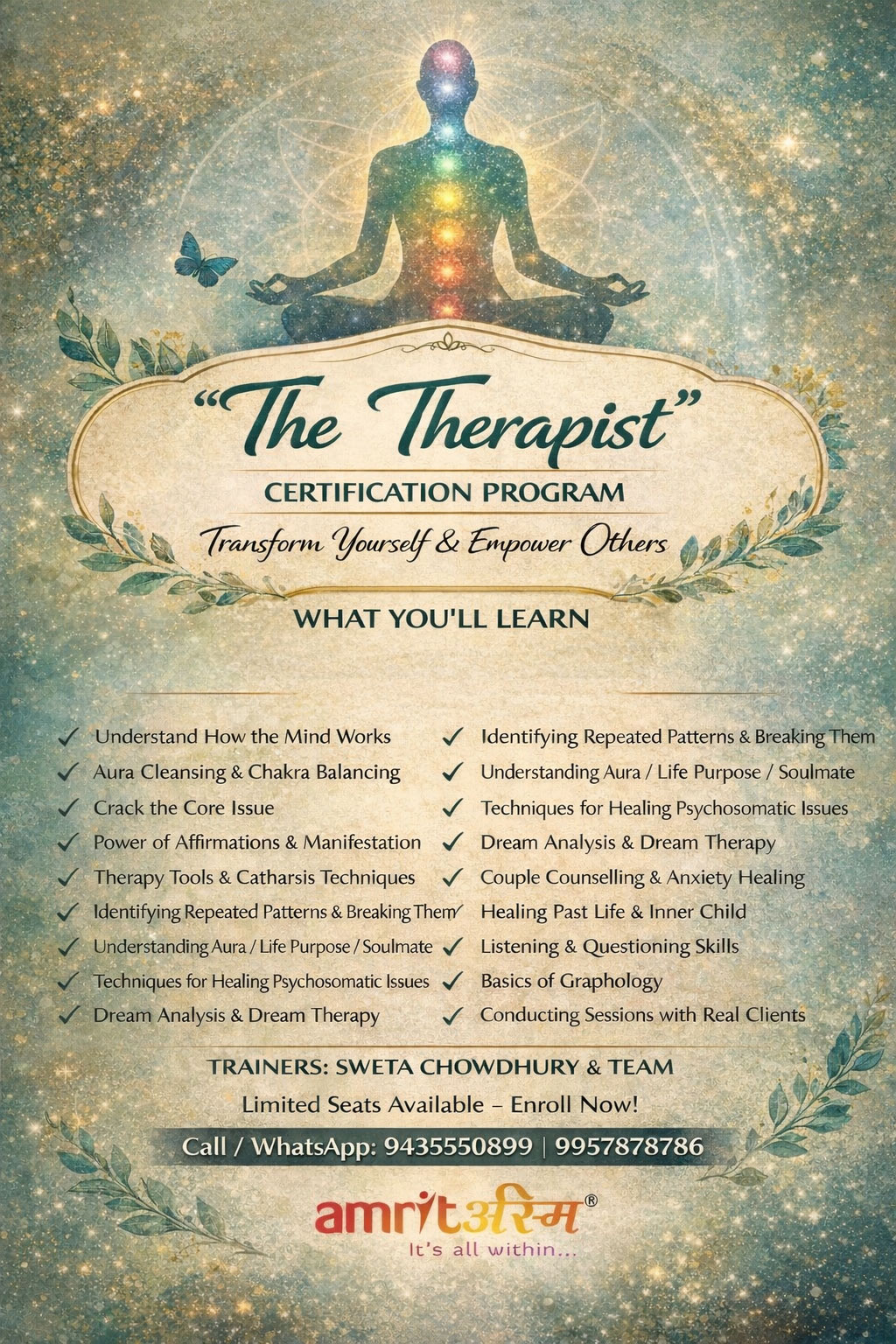 Sweta Chowdhury, Founder and Chief Trainer at Amrit Asmi Institute of Living Life, a bestselling author, a counseling psychologist and a clinical hypnotherapist, a regression therapist, is a soft skills & life skills trainer. A licensed NLP practitioner, a healer, she is practicing counseling in Guwahati, New Delhi, Mumbai and other places. She conducts training programs all over India. READ MORE