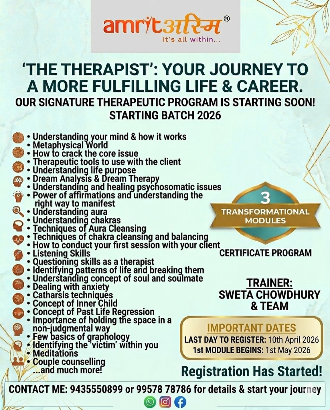 ‘The Therapist’ our new batch of our signature program is starting soon with many techniques and therapeutic tools to make your life more accomplished and which can assist you to assist others as a therapist!